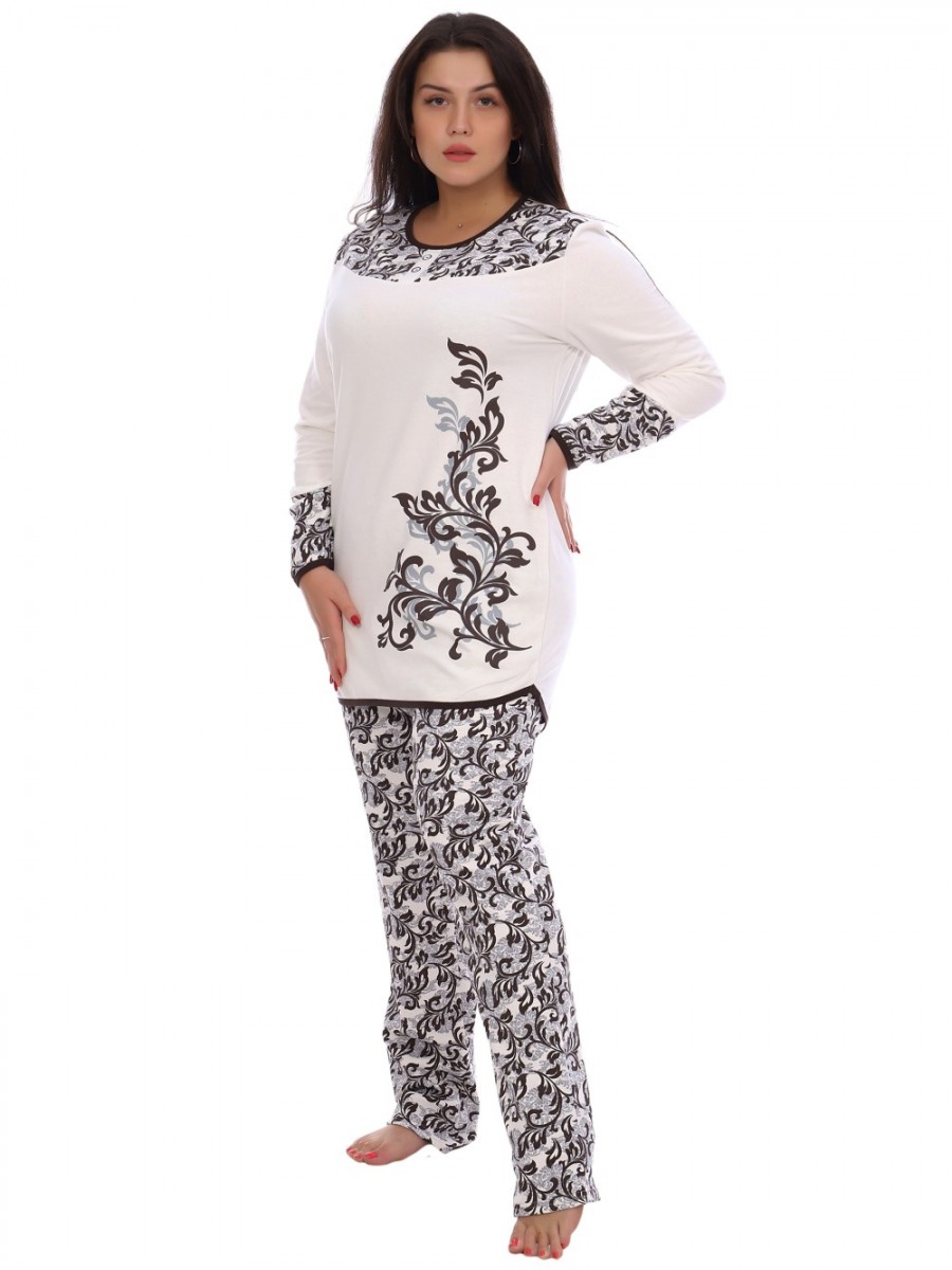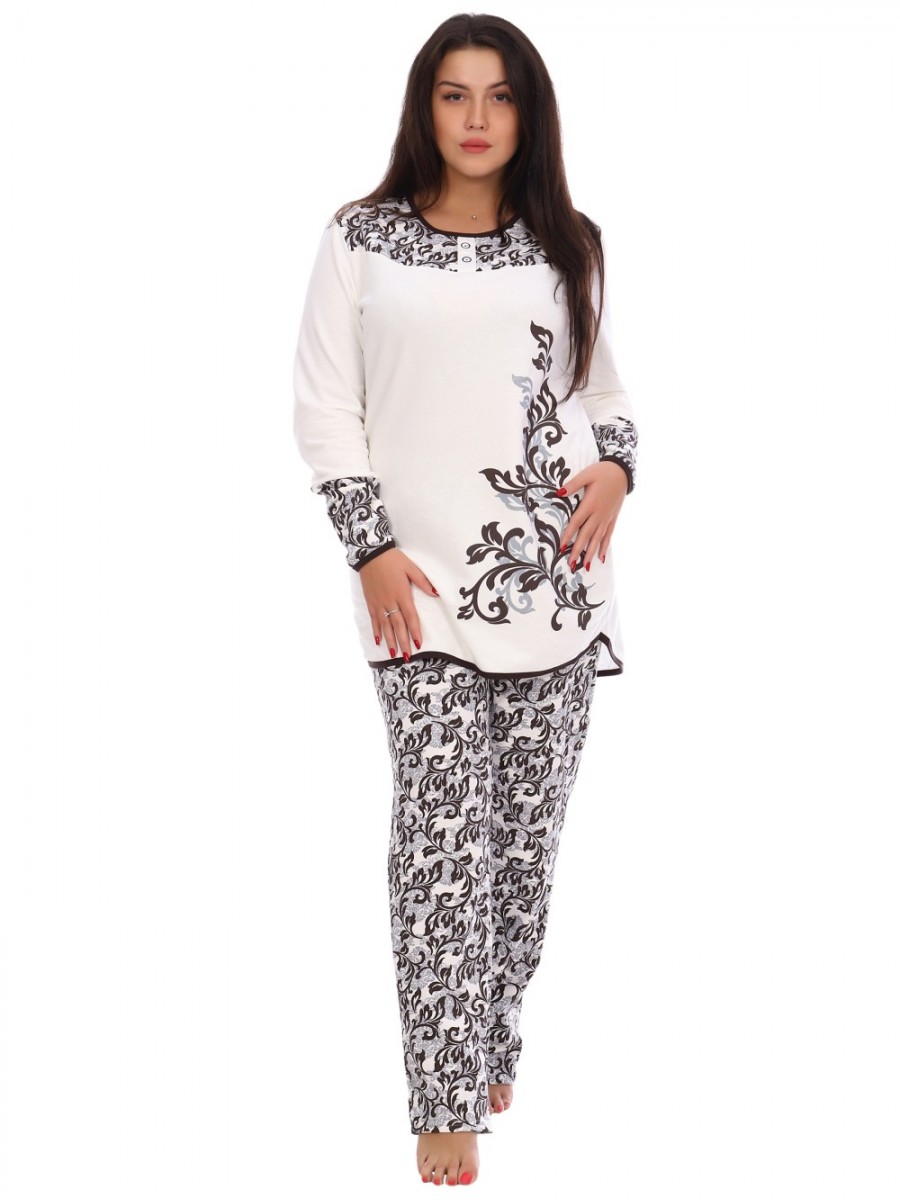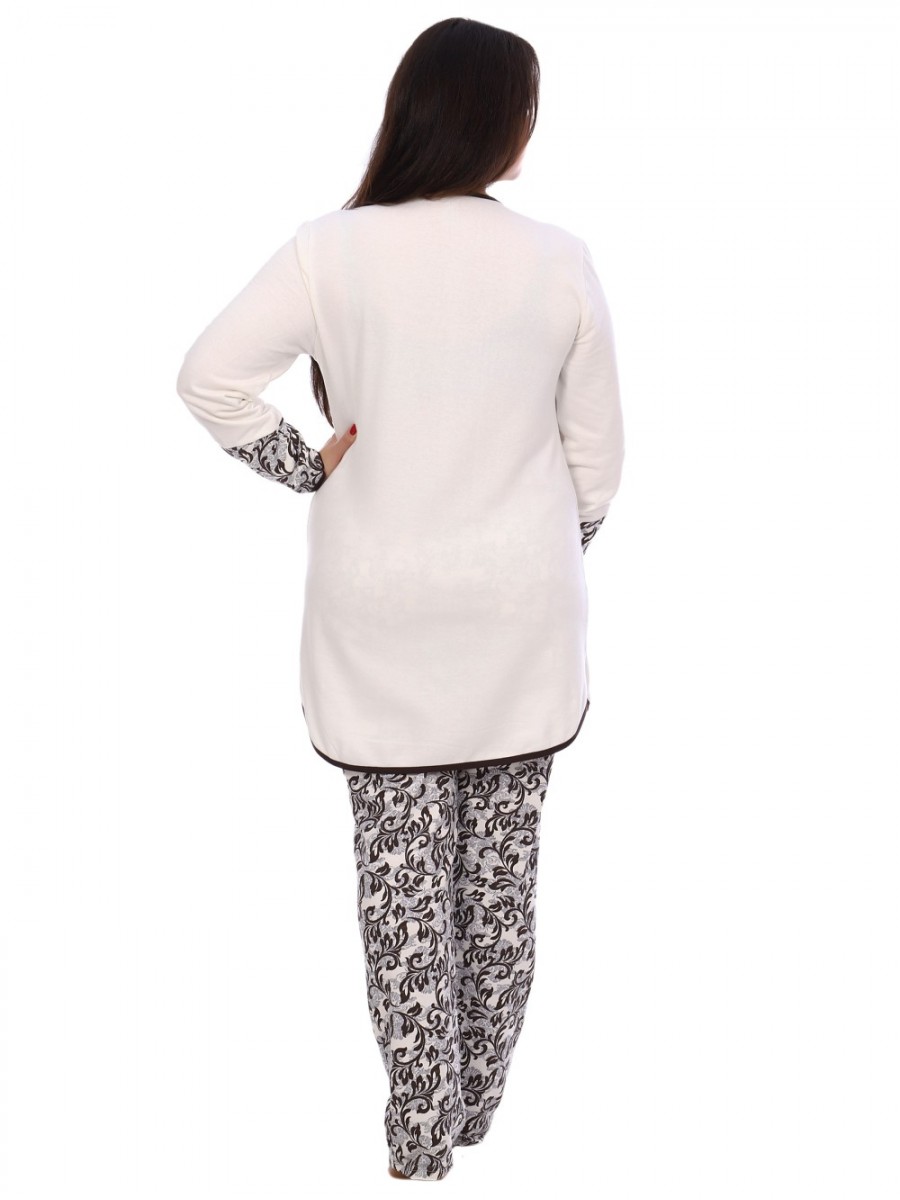 Горловина, низ кофты и рукавов обработаны окантовкой. Кокетка на полочке и манжеты выполнены из набивной ткани. На полочке оригинальный принт в виде затейливого узора. Модель согреет Вас теплом, позволит сбросить накопленное напряжение за целый день и хорошо уснуть. Мы уверены, что этот комплект подарит Вам истинное наслаждение при каждодневном использовании. Данная модель имеет размерный ряд до 70 размера.