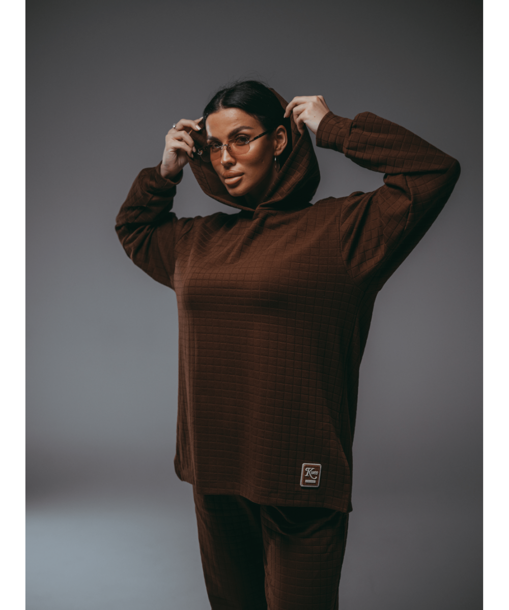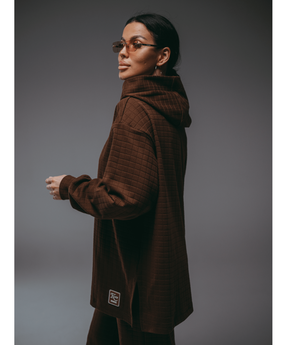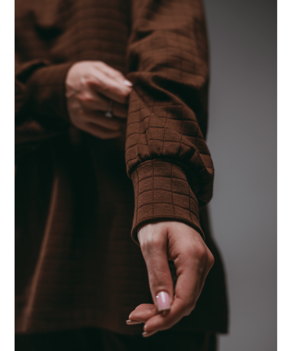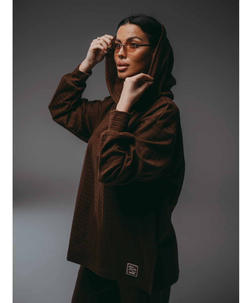 Худи – прямого кроя со спущенной линией плеча, длинным втачным рукавом на манжете.
