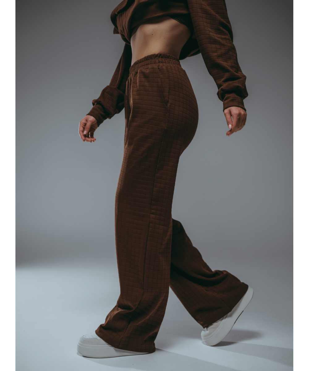 Брюки прямые от бедра с отрезным поясом и карманами.